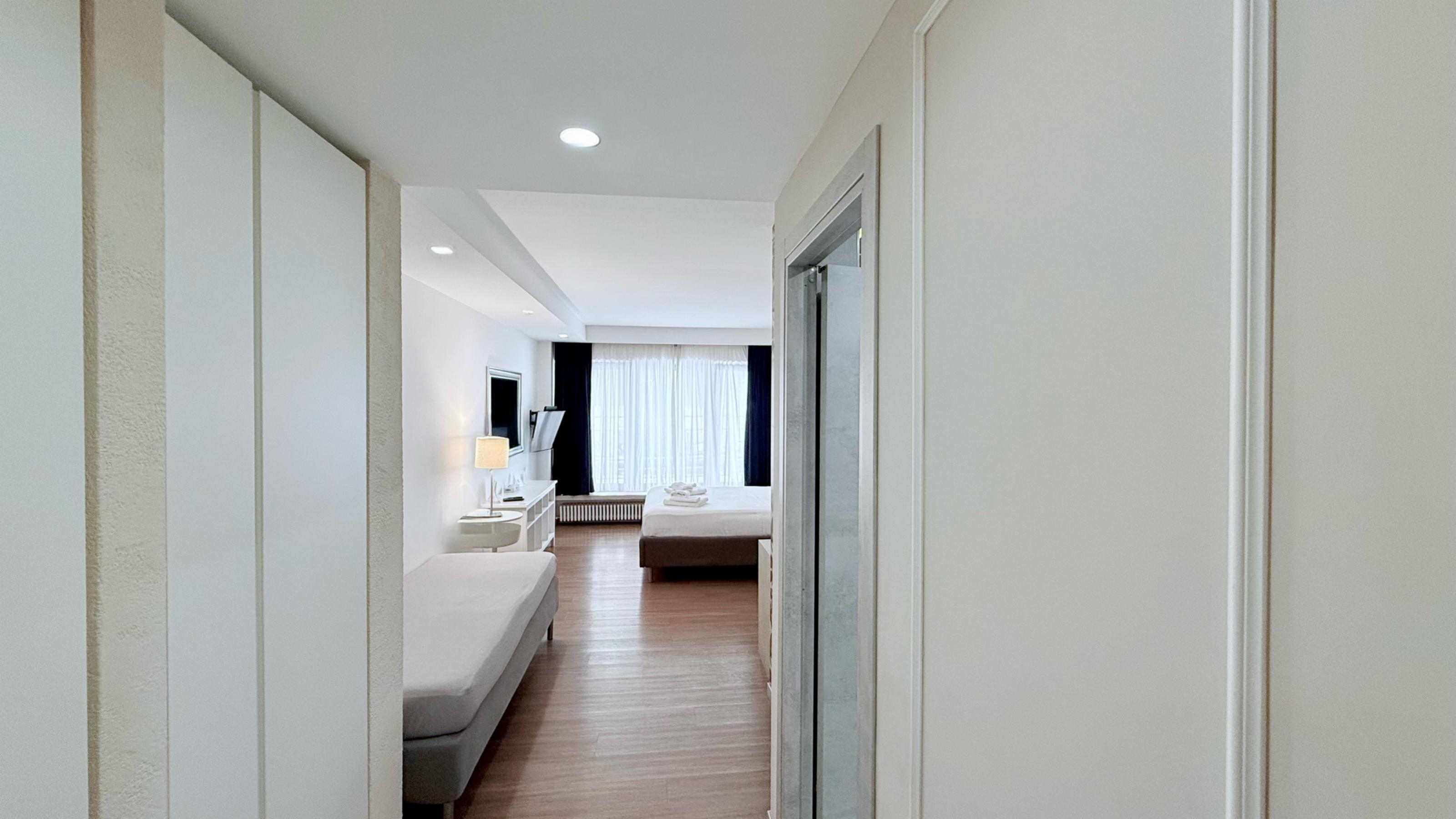 The spacious 40 square meter Suite room offers a welcoming and versatile environment, ideal for both couples and small families. Featuring a modern and comfortable design, the room is furnished with an elegant double bed, a single bed, a living area with a sofa (also a sofa bed) providing flexible solutions for guests.